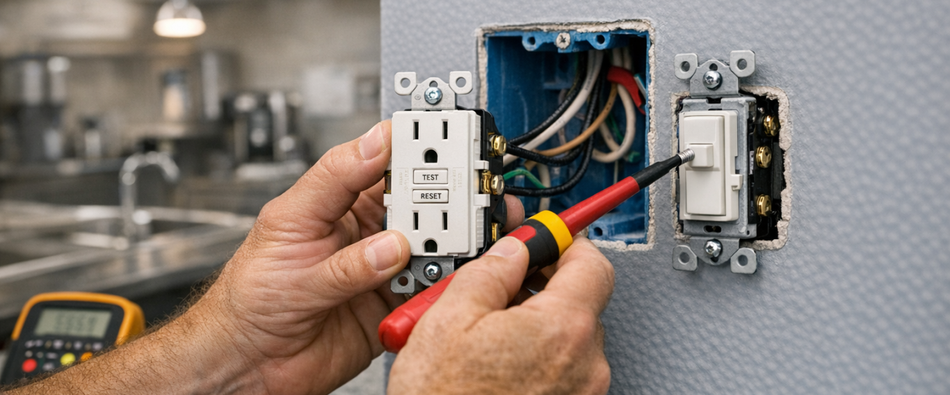 Protect employees and customers with code-compliant GFCI outlets in required areas. We install and replace GFCI protection for kitchens, restrooms, and outdoor commercial spaces.